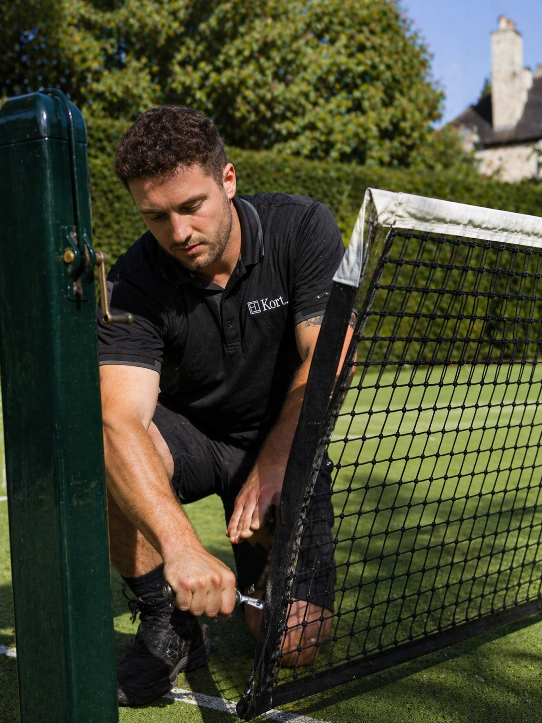 Full inspection of net posts, centre straps, winder mechanisms, cable tension, and anchor points. OEM-grade replacements carried on every service vehicle.